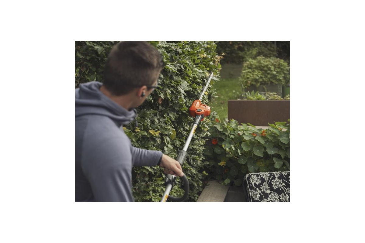 Accessoire taille-haie DH110 FLXi avec angle de coupe réglable et lames à double action. La position de coupe réglable permet de tailler plus facilement les zones difficiles d'accès. Rangement facile avec crochet inclus.