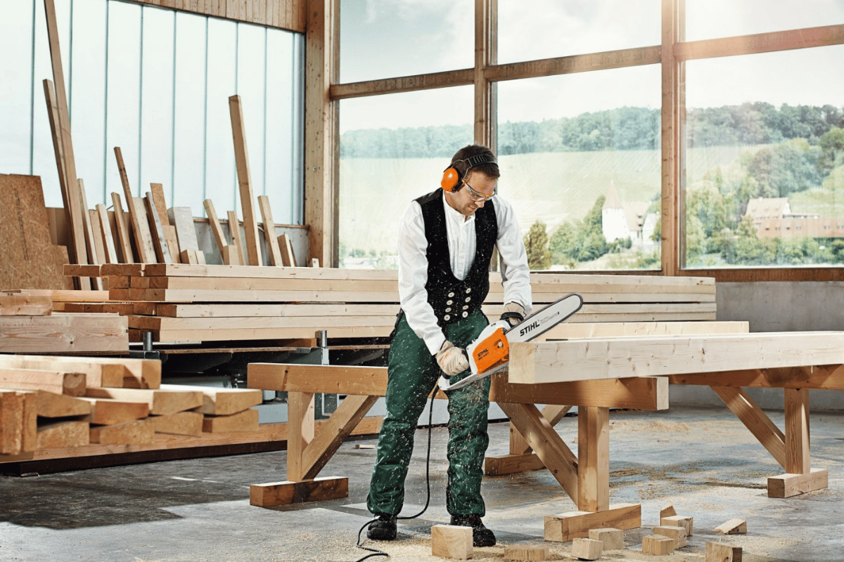 Tronçonneuse électrique professionnelle, à l'ergonomie optimisée avec tendeur de chaîne rapide STIHL (B). Optimale pour les travaux de scierie, de construction, le bricolage et la coupe de bois de chauffage.